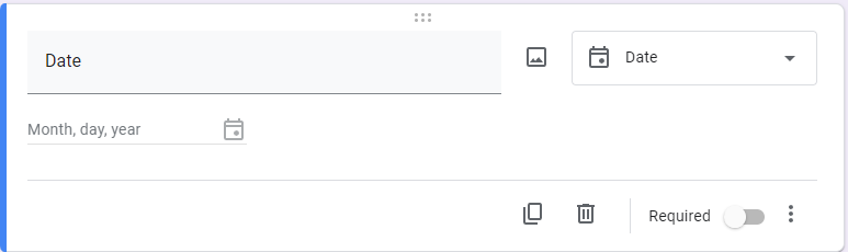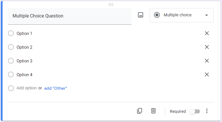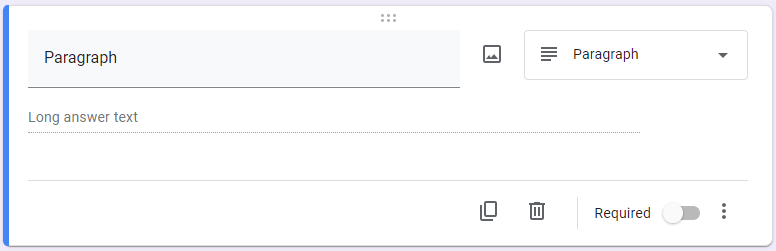 Returning to the add questions button, you can choose from various question types depending on your needs and the intention of your form. You can also establish if the form will be accepted without each question being filled out. These question types are followed by examples of how they look in Google Forms: